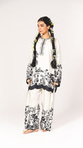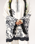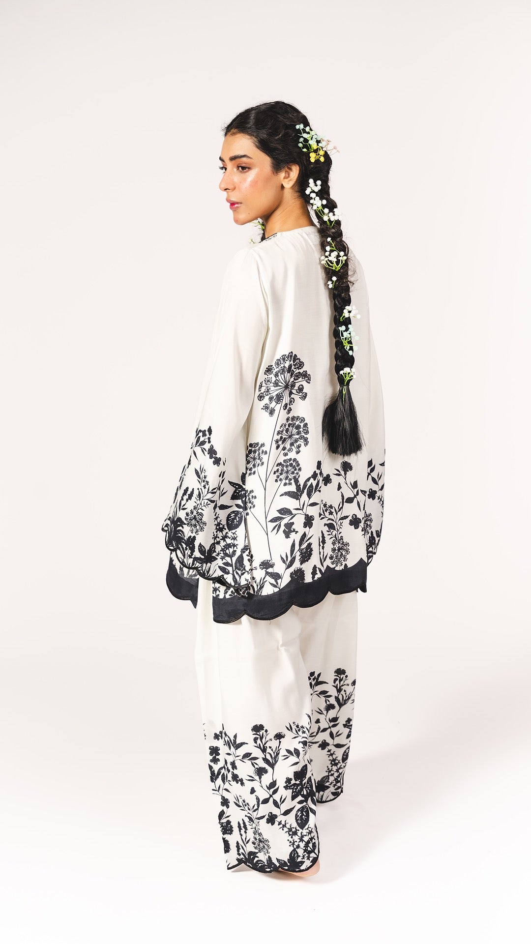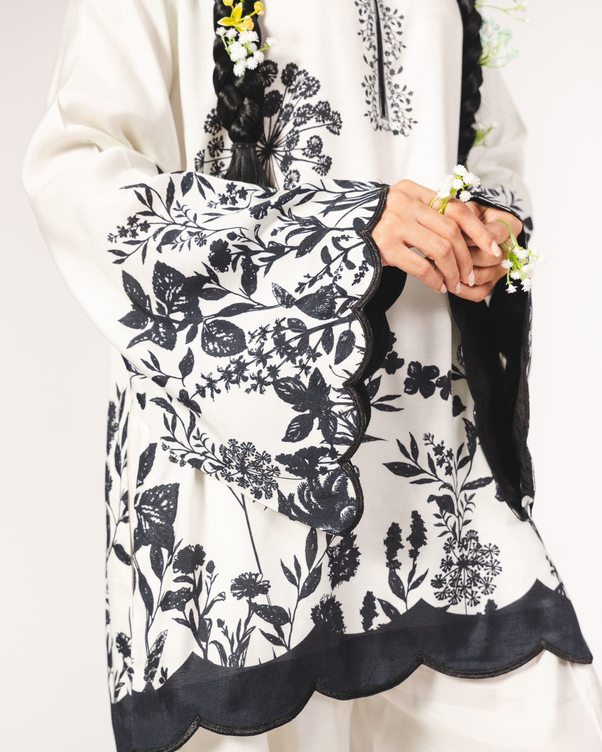 Nightrose drapes itself in soft ivory and black blooms, a contrast as gentle as moonlight brushing past a quiet garden. The floral motifs deepen with every glance, like petals that choose to open only after dusk. It features scalloped borders on the hem, sleeves and shalwar, finished with delicate matching embroidery around the edges. Paired with a farshi shalwar.