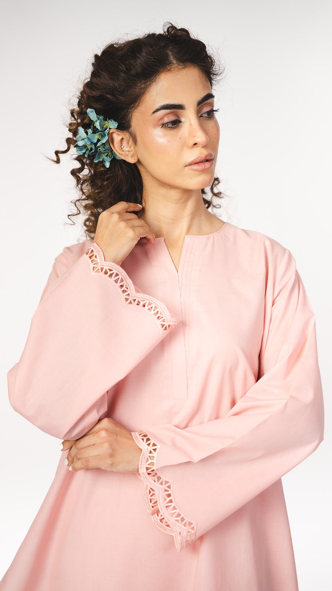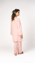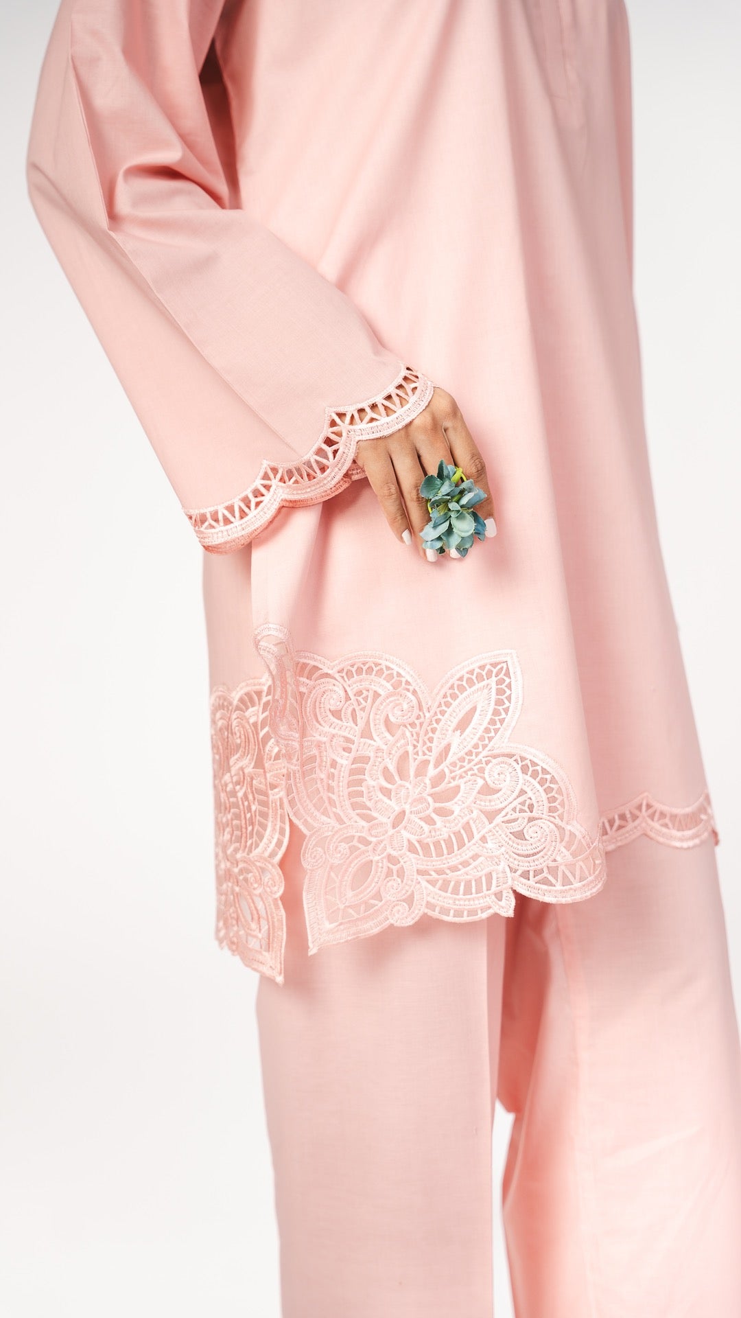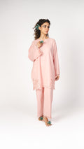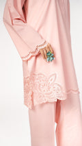 A blush pink two-piece set featuring delicate embroidery details on the hem, sleeves and trousers with subtle scalloped finishes, and a minimal pleated neckline. A timeless wardrobe staple with a gentle, romantic touch, perfect for everyday wear.