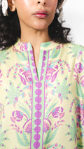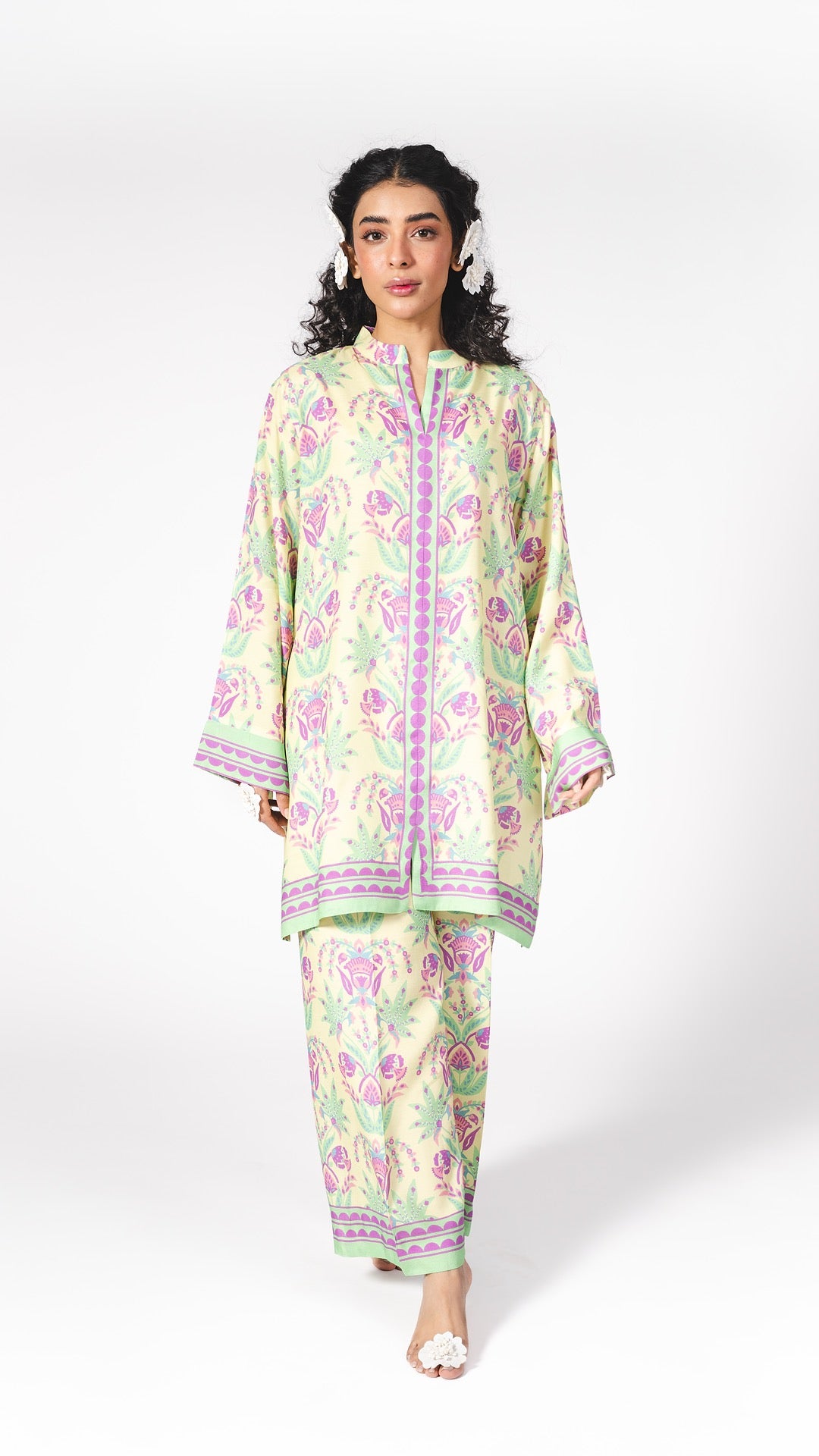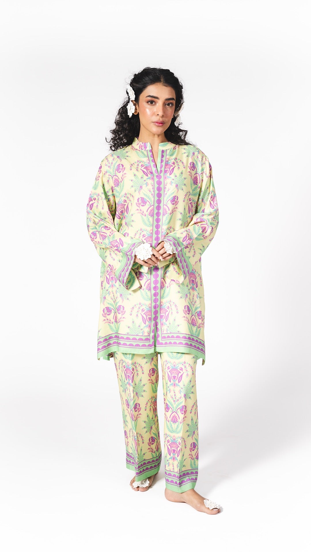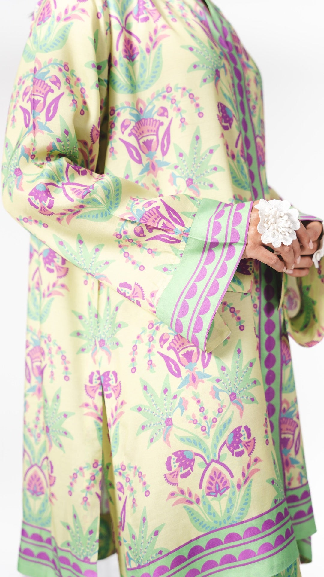 Primrose features soft pastels and a blooming botanical print in an easy, relaxed silhouette. Finished with delicate borders and open-cuff sleeves.