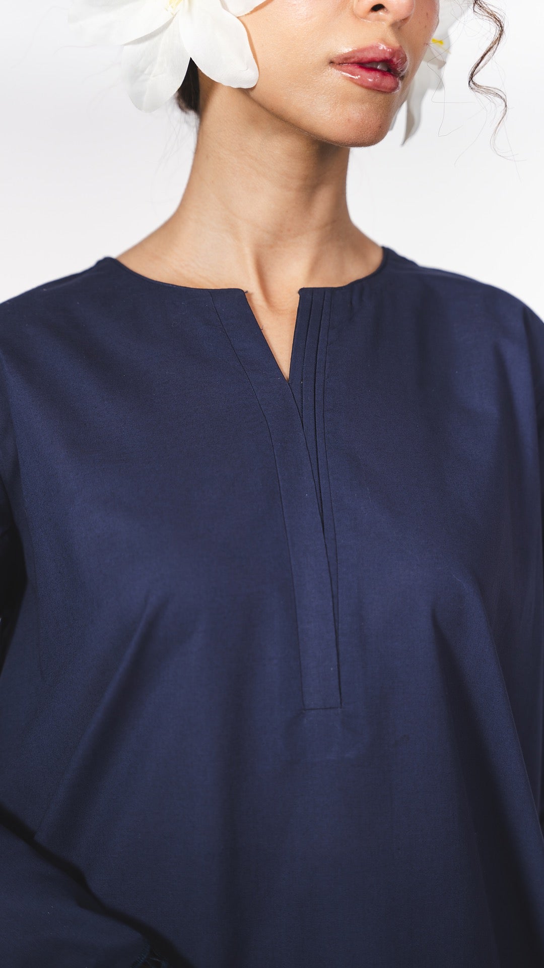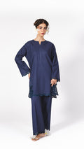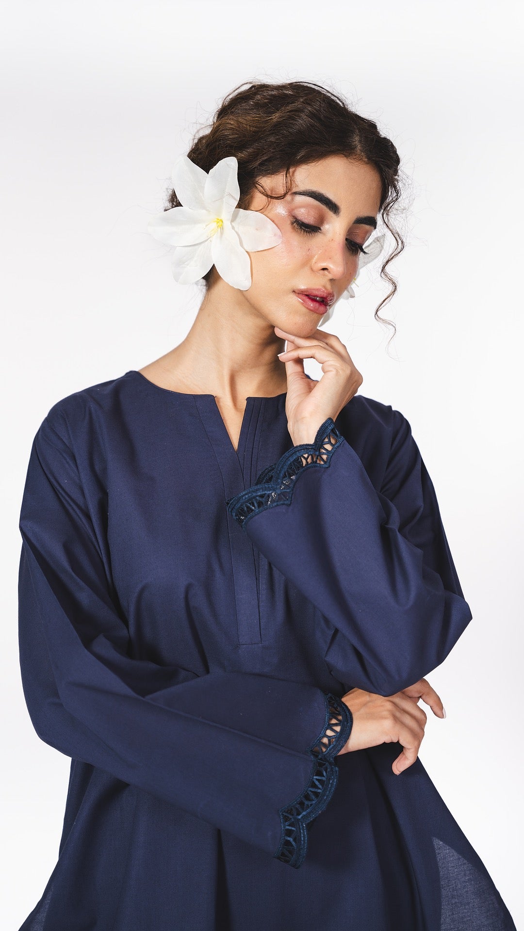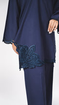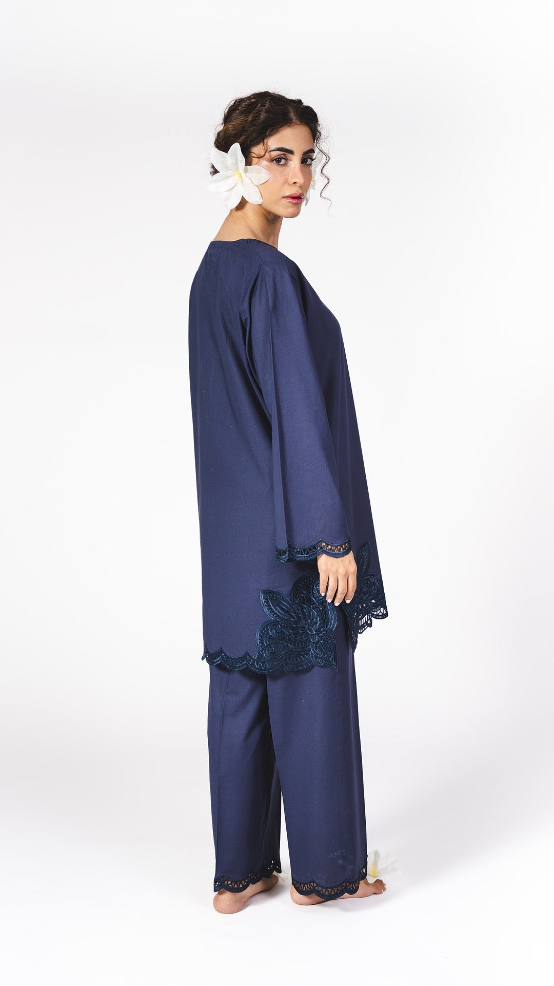 Twilight glows in deep, serene navy. Detailed with delicately scalloped floral cutwork embroidery on the hem, sleeves and trousers, this set carries the quiet romance of dusk—soft, calm, and beautifully composed. The relaxed fit drapes with ease.